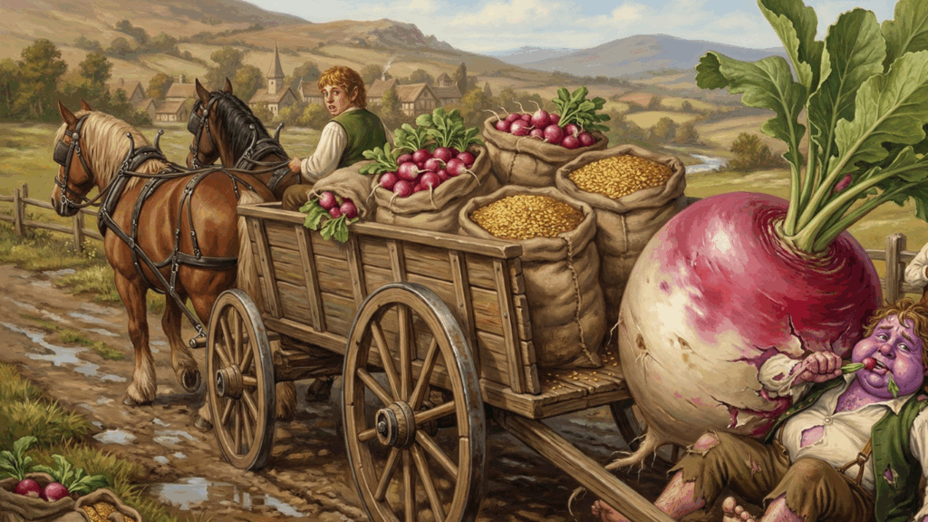 A viagem de volta teria sido muito tranquila, não fosse um dos nossos contratados, Maret, um Hobbit gorducho e fanfarrão, morder um dos rabanetes que explodiu em crescimento e o esmagou, literalmente, ficando do tamanho da nossa carroça.