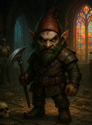 Gnomo druída, fedorento, que acreditava que comandava esqueletos, que discordaram dele.