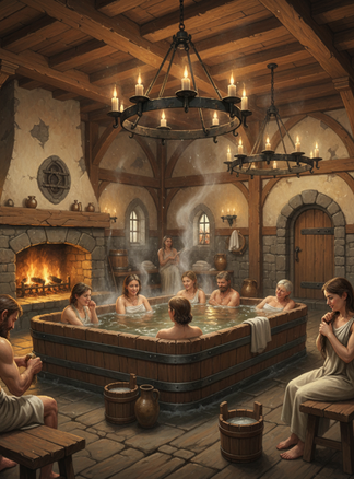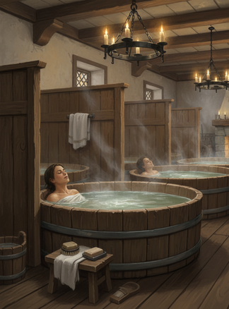 Para aqueles que prezam pela privacidade, oferecemos as Salas de Banho Individuais. Em seu próprio barril de madeira, desfrute de águas fumegantes e sais aromáticos, longe do burburinho da taverna. Um refúgio tranquilo para se limpar e meditar, preparando-se para o dia seguinte ou relaxando após um dia exaustivo.